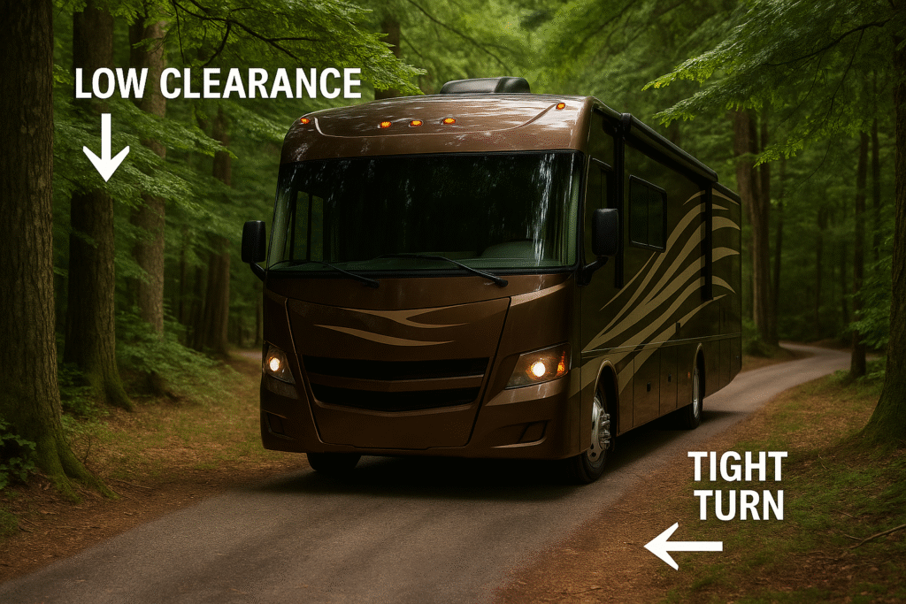 Before clicking “Book Now,” take a closer look at how you’ll actually get to your site. Many campgrounds were built decades ago when RVs were smaller, and road width, low branches, or narrow pads can cause real problems for modern rigs.